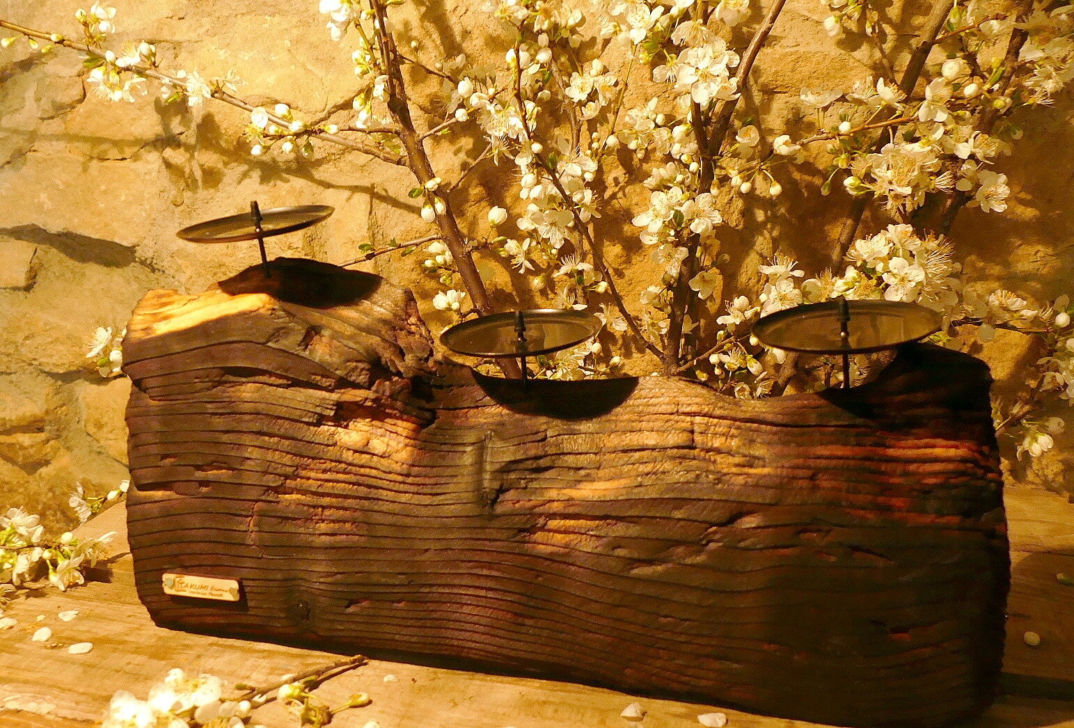Pieza de viga de madera de deriva tratada con la ténica Yakisugi (consiste en quemar la madera) para tres velas. Se aprecia la belleza del desgaste, rústico, único y con personalidad.